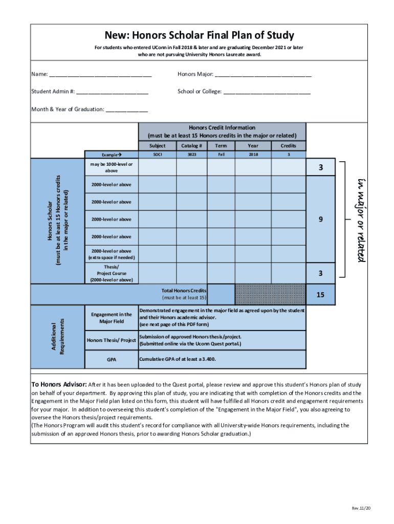 New: Honors Scholar Final Plan of Study For students who entered Conn in Fall 2018 & later and are graduating from December 2021 or later who are not pursuing University Honors Laureate award. Name: