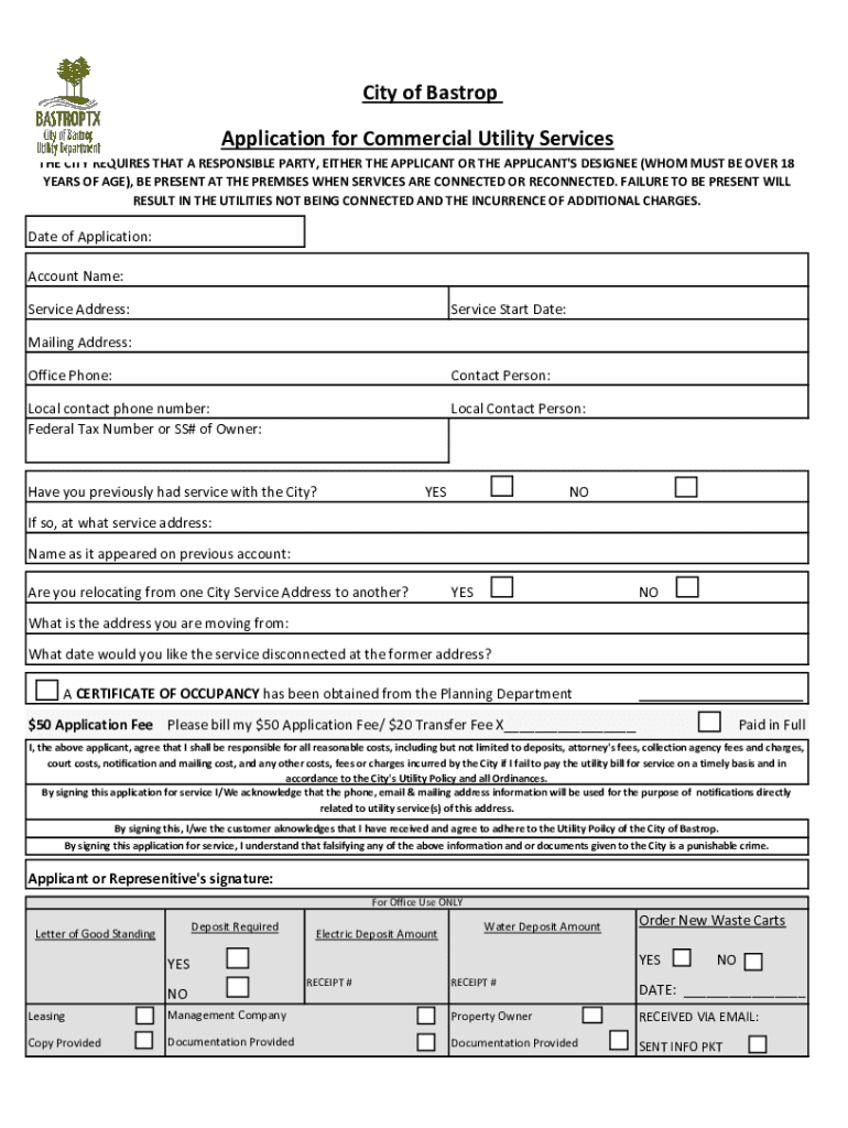 City of Bastrop Application for Commercial Utility Services THE CITY REQUIRES THAT A RESPONSIBLE PARTY, EITHER THE APPLICANT OR THE APPLICANT\'S DESIGNEE (WHOM MUST BE OVER 18 YEARS OF AGE), BE PRESENT