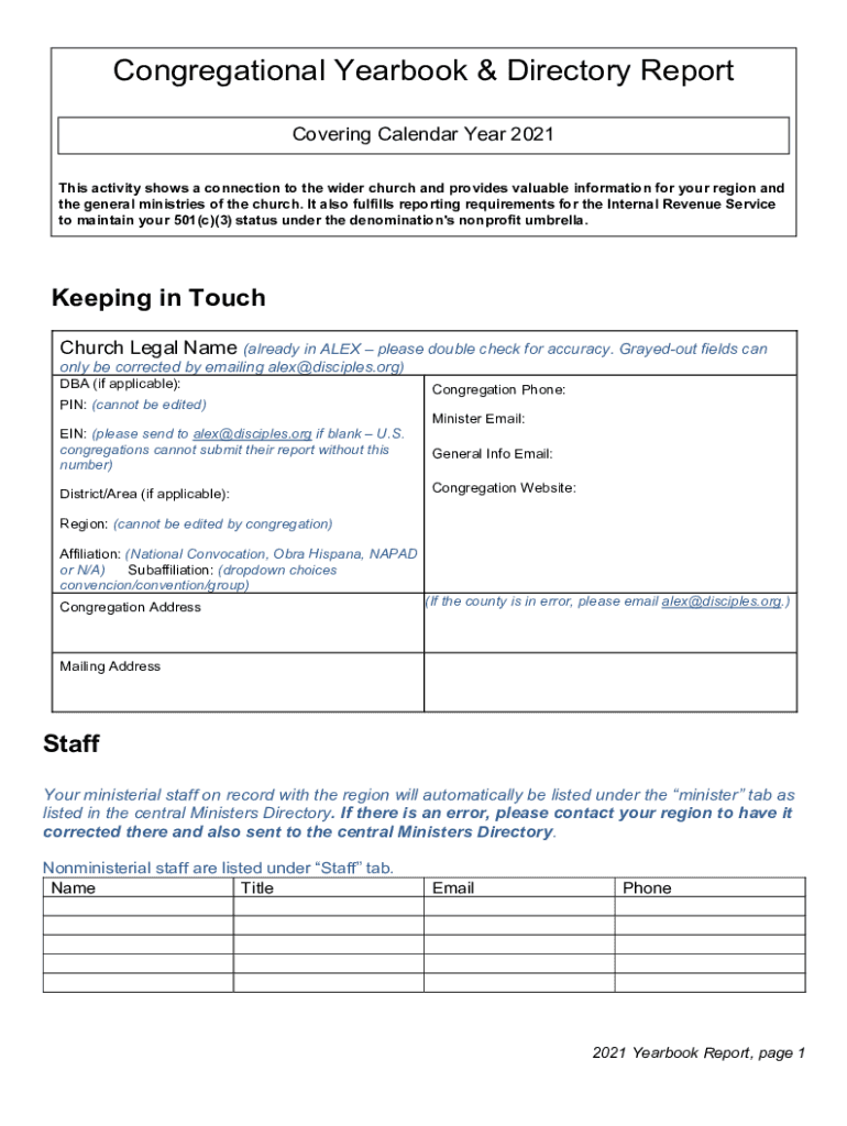 Congregational Yearbook & Directory Report Covering Calendar Year 2021 This activity shows a connection to the wider church and provides valuable information for your region and the general ministries