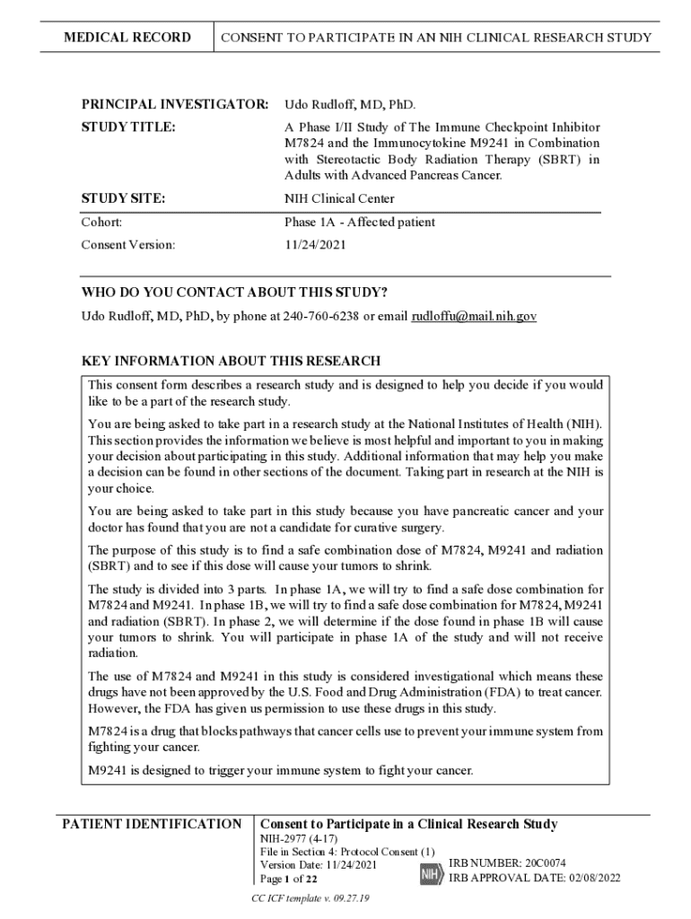 MEDICAL RECORDCONSENT TO PARTICIPATE IN AN NIH CLINICAL RESEARCH STUDYPRINCIPAL INVESTIGATOR:Udo Runoff, MD, PhD.STUDY TITLE:A Phase I/II Study of The Immune Checkpoint Inhibitor M7824 and the Immunocytokine