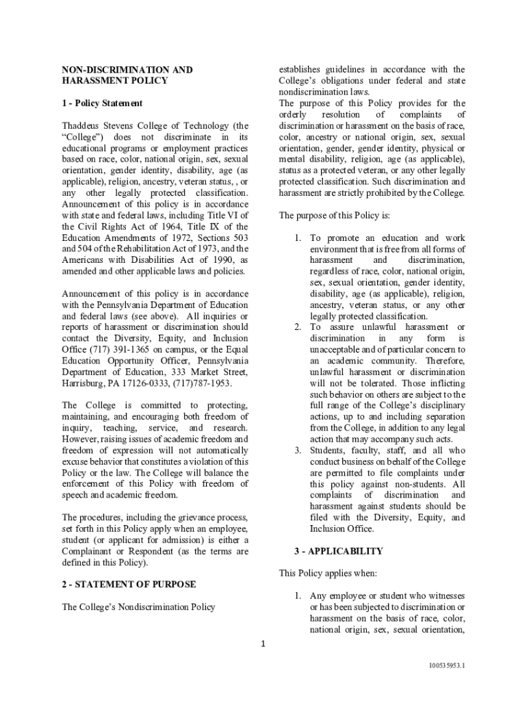 NONDISCRIMINATION AND HARASSMENT POLICY establishes guidelines in accordance with the Colleges obligations under federal and state nondiscrimination laws. The purpose of this Policy provides for the