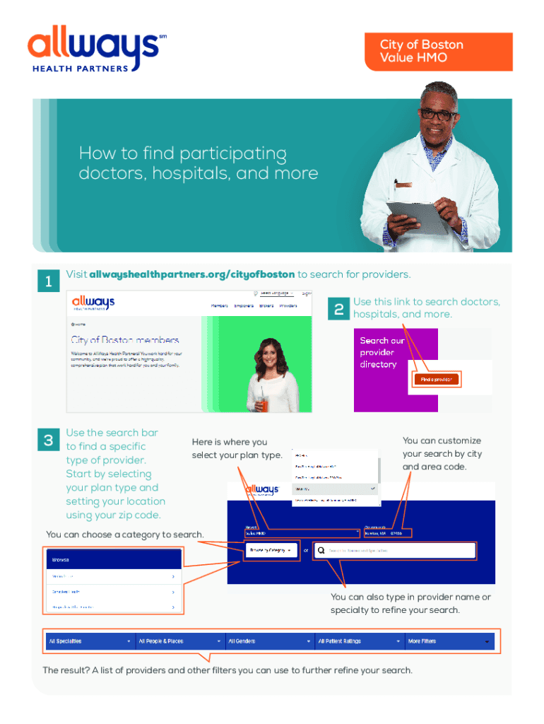 City of Boston Value Moho to find participating doctors, hospitals, and more1Visit allwayshealthpartners.org/cityofboston to search for providers.23Use the search bar to find a specific type of provider.
