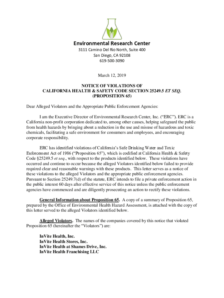 Environmental Research Center 3111 Camino Del Rio North, Suite 400 San Diego, CA 92108 6195003090 March 12, 2019, NOTICE OF VIOLATIONS OF CALIFORNIA HEALTH & SAFETY CODE SECTION 25249.5 ET SEQ. (PROPOSITION