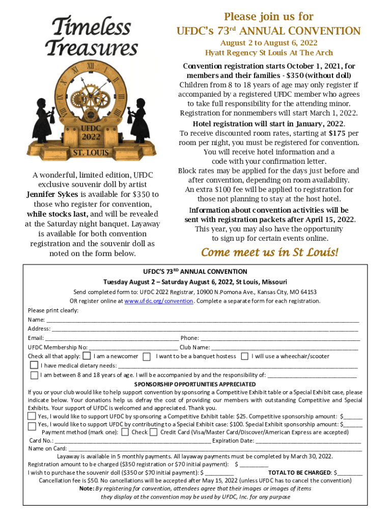 Please join us for UFD Cs 73rd ANNUAL CONVENTION August 2 to August 6, 2022, Hyatt Regency St Louis At The Arch Convention registration starts October 1, 2021, for members and their families $350
