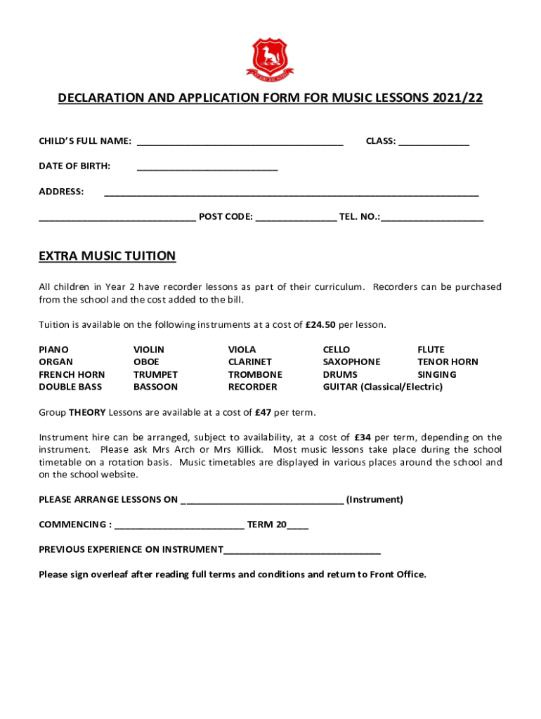 DECLARATION AND APPLICATION FORM FOR MUSIC LESSONS 2021/22 CHILD FULL NAME: ___ DATE OF BIRTH: ADDRESS:CLASS: ____________ POST CODE: ___ TEL. NO.:___EXTRA MUSIC TUITION All children in Year 2 have