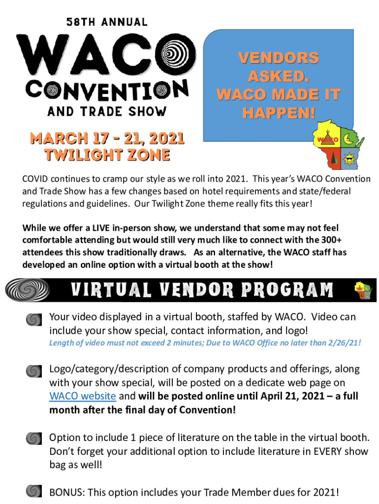 VENDORS ASKED. WACO MADE IT HAPPEN!COVID-19 continues to cramp our style as we roll into 2021. This year's WACO Convention and Trade Show has a few changes based on hotel requirements and state/federal