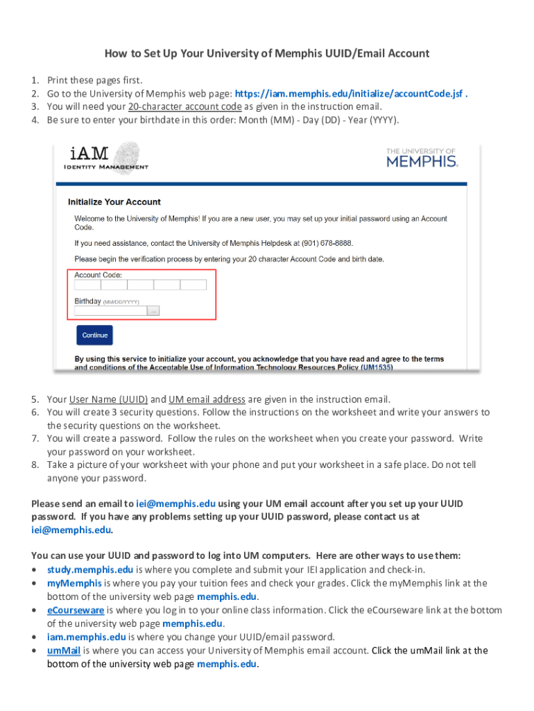 How to Set Up Your University of Memphis UUID/Email Account 1. 2. 3. 4. Print these pages first. Go to the University of Memphis web page: https://iam.memphis.edu/initialize/accountCode.jsf. You will