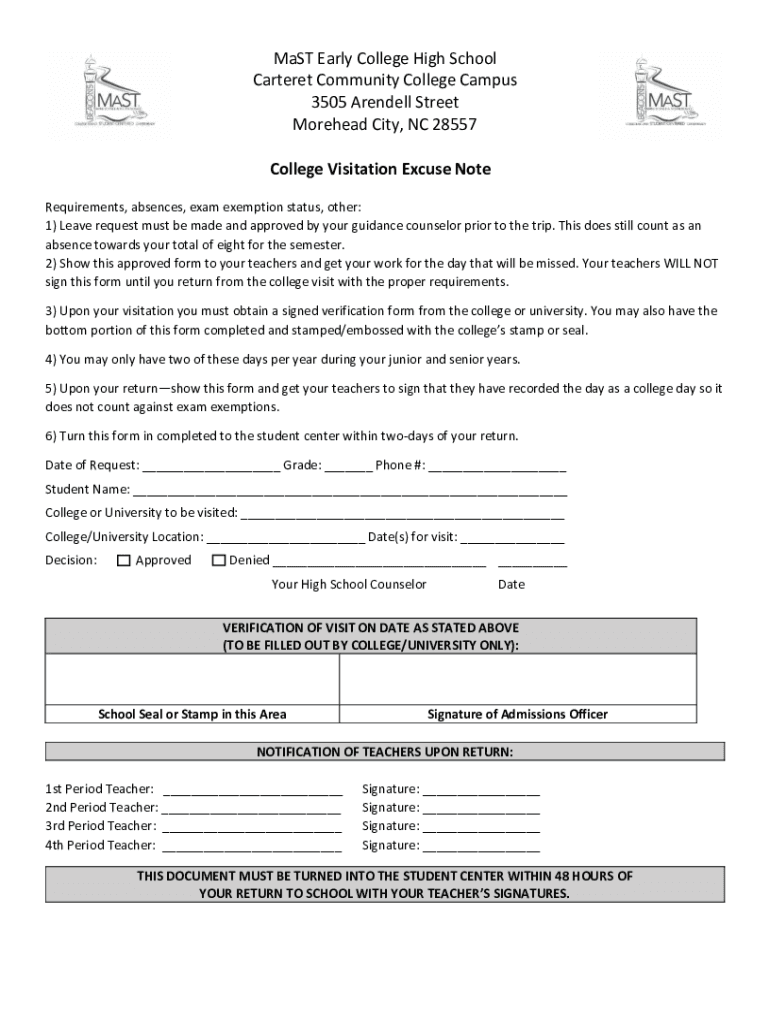 Mast Early College High School Carteret Community College Campus 3505 Aren't dell Street Forehead City, NC 28557 College Visitation Excuse Note Requirements, absences, exam exemption status, other: