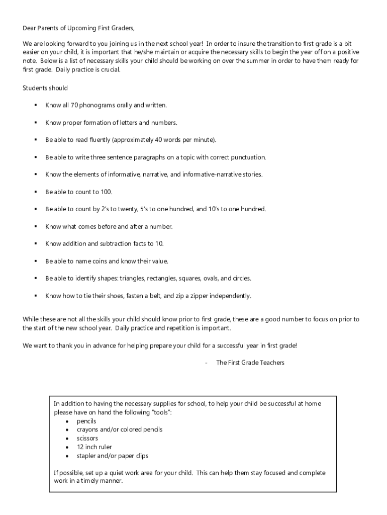 Dear Parents of Upcoming First Graders, We are looking forward to you joining us in the next school year! In order to insure the transition to first grade is a bit easier on your child, it is important