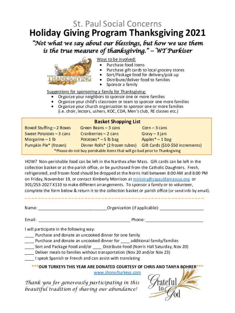 St. Paul Social Concerns Holiday Giving Program Thanksgiving 2021 Not what we say about our blessings, but how we use them is the true measure of thanksgiving. WT Purser Ways to be involved: Purchase