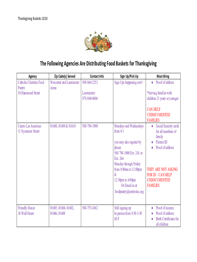Thanksgiving Baskets 2020The Following Agencies Are Distributing Food Baskets for Thanksgiving Agency Catholic Charities Food Pantry 10 Hammond StreetCentro Las Americas 11 Sycamore Street Code(s)