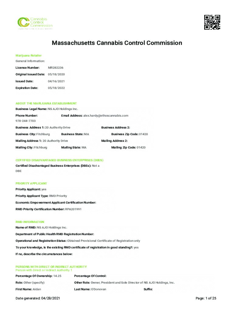 Massachusetts Cannabis Control Commission Marijuana Retailer General Information: License Number:MR282236Original Issued Date: 05/18/2020 Issued Date:04/16/2021Expiration Date:05/18/2022ABOUT THE