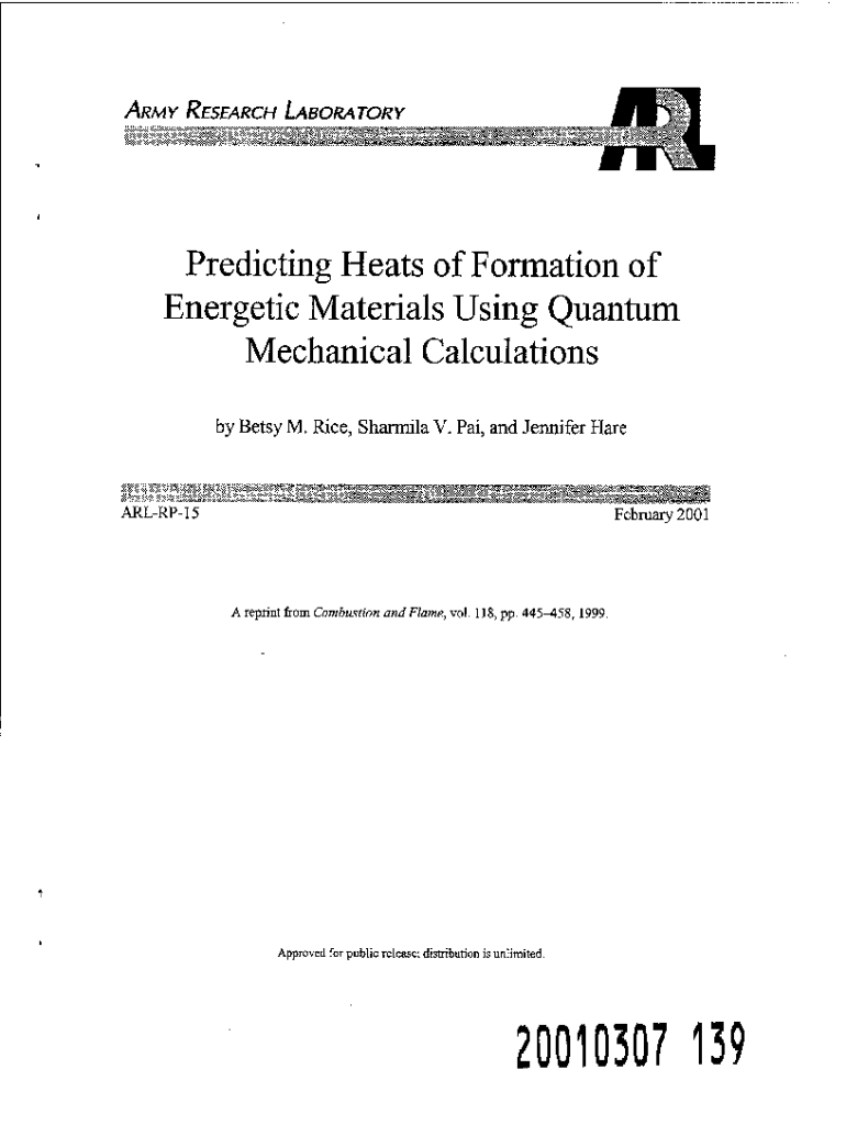 ARMY RESEARCH LABORATORYPredicting Heats of Formation of Energetic Materials Using Quantum Mechanical Calculations by Betsy M. Rice, Sharia V. Pie, and Jennifer HareARLRP15February 2001A reprint from