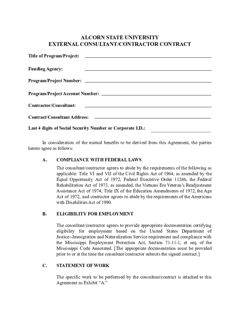 Get the free alcorn state university external consultant/contractor contract