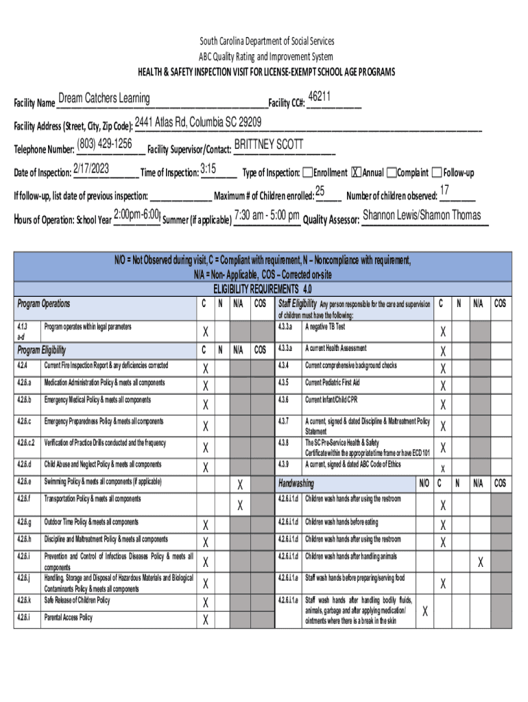 South Carolina Department of Social Services ABC Quality Rating and Improvement System HEALTH & SAFETY INSPECTION VISIT FOR LICENSEEXEMPT SCHOOL AGE PROGRAMS46211 Dream Catchers Learning Facility