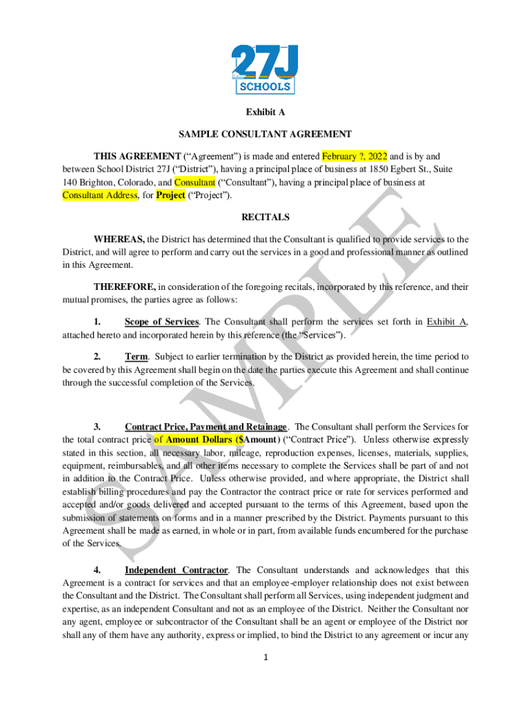 Exhibit A SAMPLE CONSULTANT AGREEMENT THIS AGREEMENT (Agreement) is made and entered February ?, 2022 and is by and between School District 27J (District), having a principal place of business at