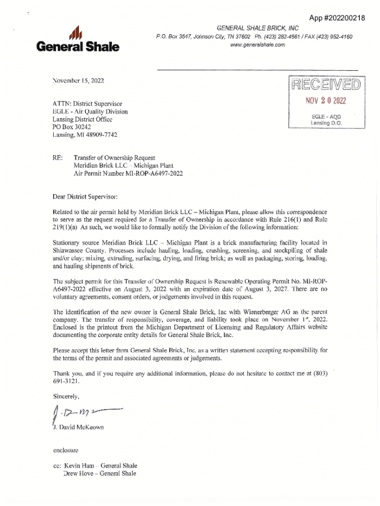 __App #202200218,_GENERAL SHALE BRICK, INC P. 0. Box 3547, Johnson City, TN 37602 pH. (423) 2824661 I FAX (423) 9524160General Shale November 15, 2022ATTN: District Supervisor EAGLE Air Quality Division