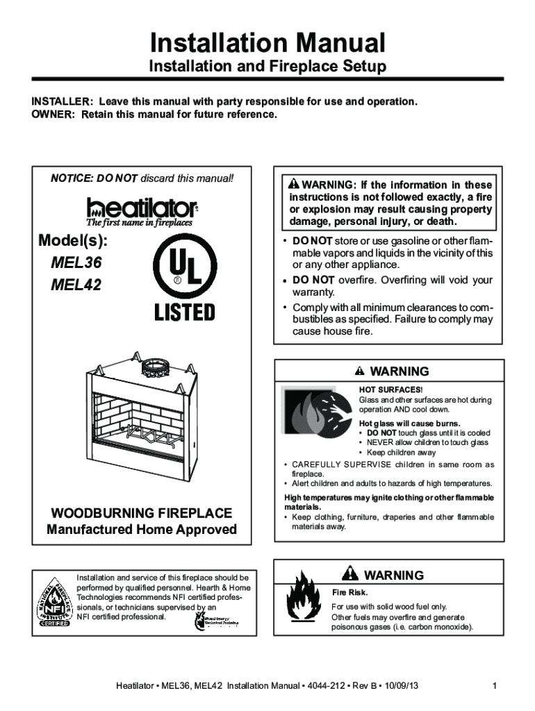 Installation ManualInstallation and Fireplace Setup INSTALLER: Leave this manual with party responsible for use and operation. OWNER: Retain this manual for future reference.NOTICE: DO NOT discard