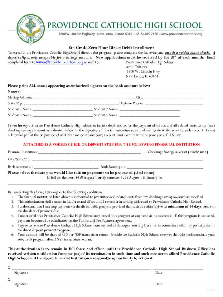 8th Grade Zero Hour Direct Debit Enrollment To enroll in the Providence Catholic High School direct debit program, please complete the following and attach a voided blank check. A deposit slip is