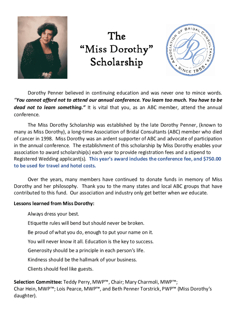 The Miss Dorothy Scholarship Dorothy Penned believed in continuing education and was never one to mince words. You cannot afford not to attend our annual conference. You learn too much. Furthermore,