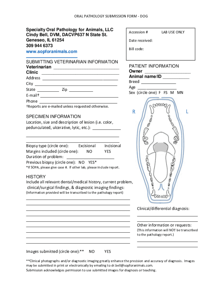 ORAL PATHOLOGY SUBMISSION FORM Specialty Oral Pathology for Animals, LLC Cindy Bell, DVM, DACVP637 N State St. Geneses, IL 61254 309 944 6373 www.sopforanimals.com SUBMITTING VETERINARIAN INFORMATION