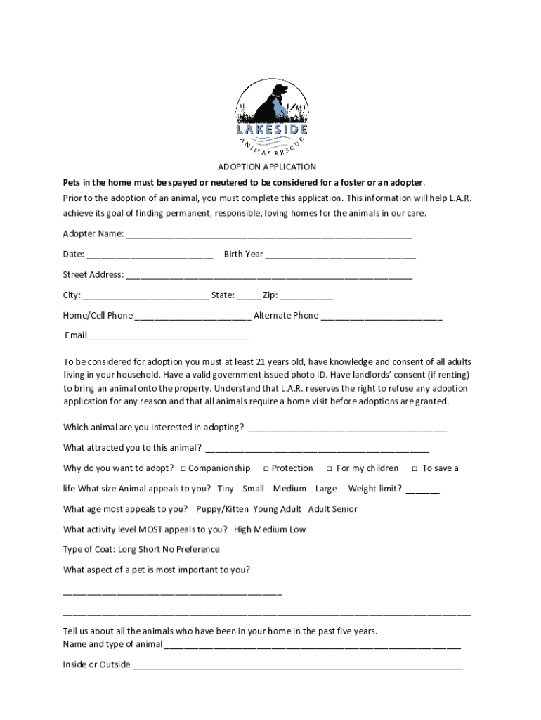 ADOPTION APPLICATION Pets in the home must be spayed or neutered to be considered for a foster or an adopter. Prior to the adoption of an animal, you must complete this application. This information