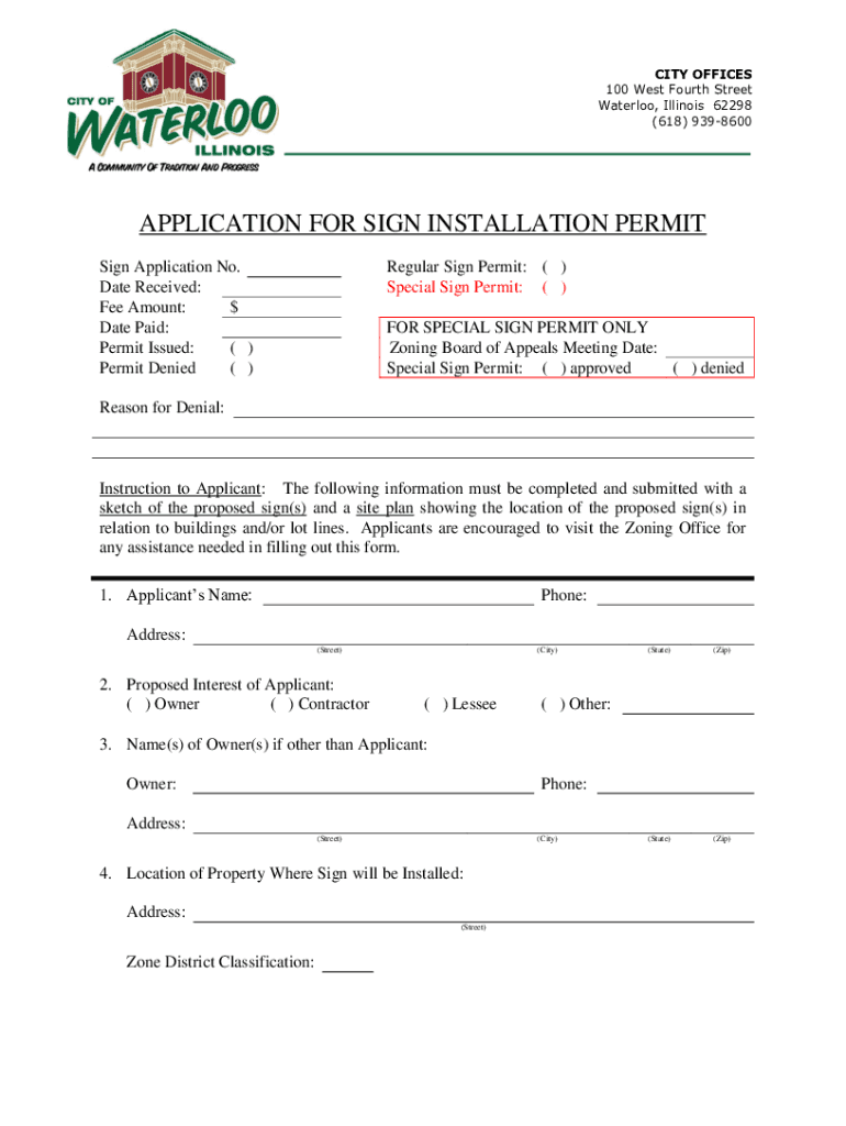 CITY OFFICES 100 West Fourth Street Waterloo, Illinois 62298 (618) 9398600APPLICATION FOR SIGN INSTALLATION PERMIT Sign Application No. Date Received: Fee Amount: $ Date Paid: Permit Issued: () Permit