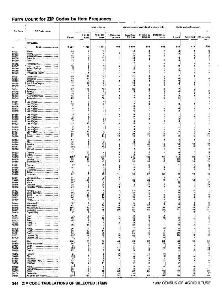 Farm Count for ZIP Codes by Item Frequency Market value of agricultural products sold Land in farmsCattie and calf inventory ZIP Code name ZIP CodeFarms1 to 49 acres50 to 999 acres1,000 acres armorless