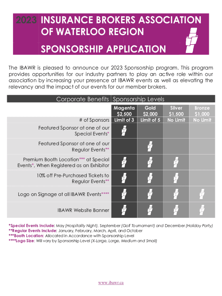 2023 INSURANCE BROKERS ASSOCIATION OF WATERLOO REGION SPONSORSHIP APPLICATION The BAR is pleased to announce our 2023 Sponsorship program. This program provides opportunities for our industry partners