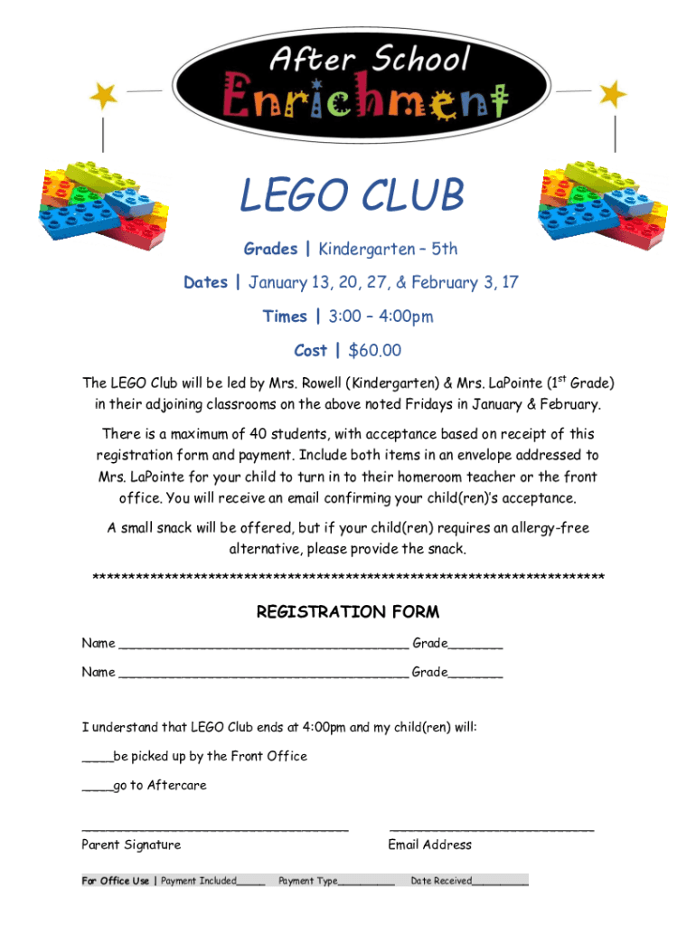 The LEGO Club will be led by Mrs. Rowell (Kindergarten) & Mrs. Appointed (1st Grade)