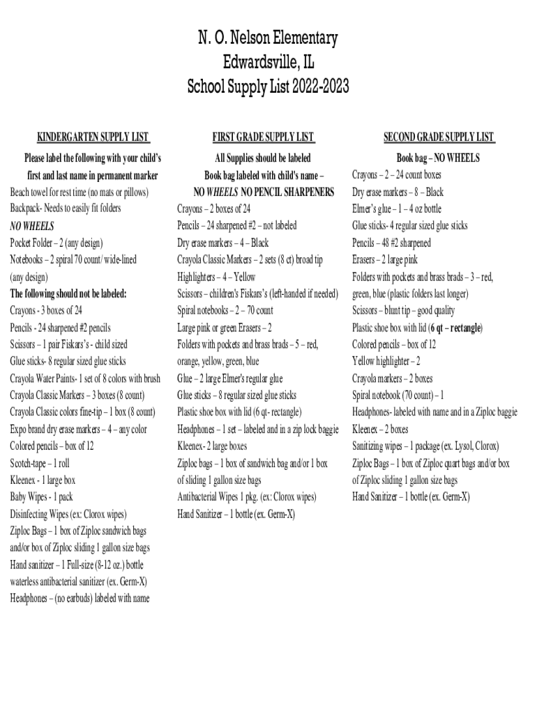N. O. Nelson Elementary Edwardsville, IL School Supply List 20222023 KINDERGARTEN SUPPLY LIST Please label the following with your children first and last name in permanent marker Beach towel for