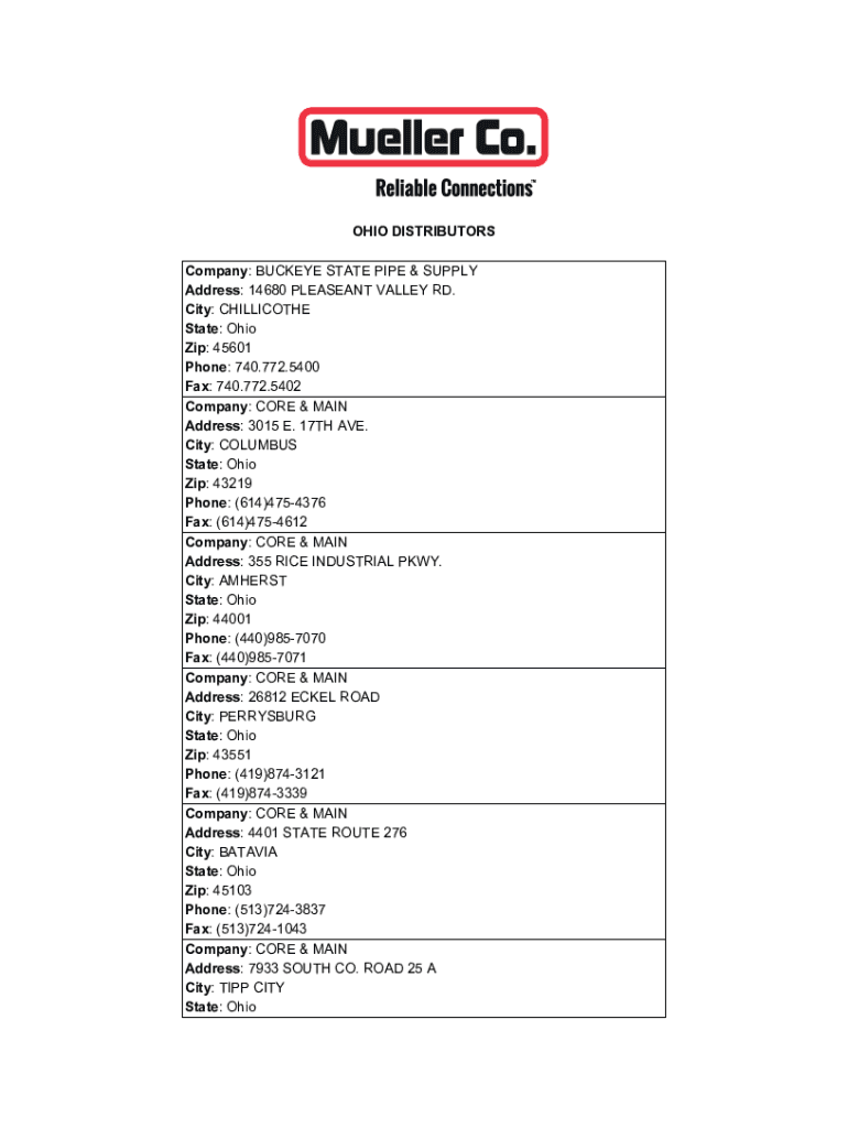 OHIO DISTRIBUTORS Company: BUCKEYE STATE PIPE & SUPPLY Address: 14680 PLEASANT VALLEY RD. City: CHILLICOTHE State: Ohio Zip: 45601 Phone: 740.772.5400 Fax: 740.772.5402 Company: CORE & MAIN Address: