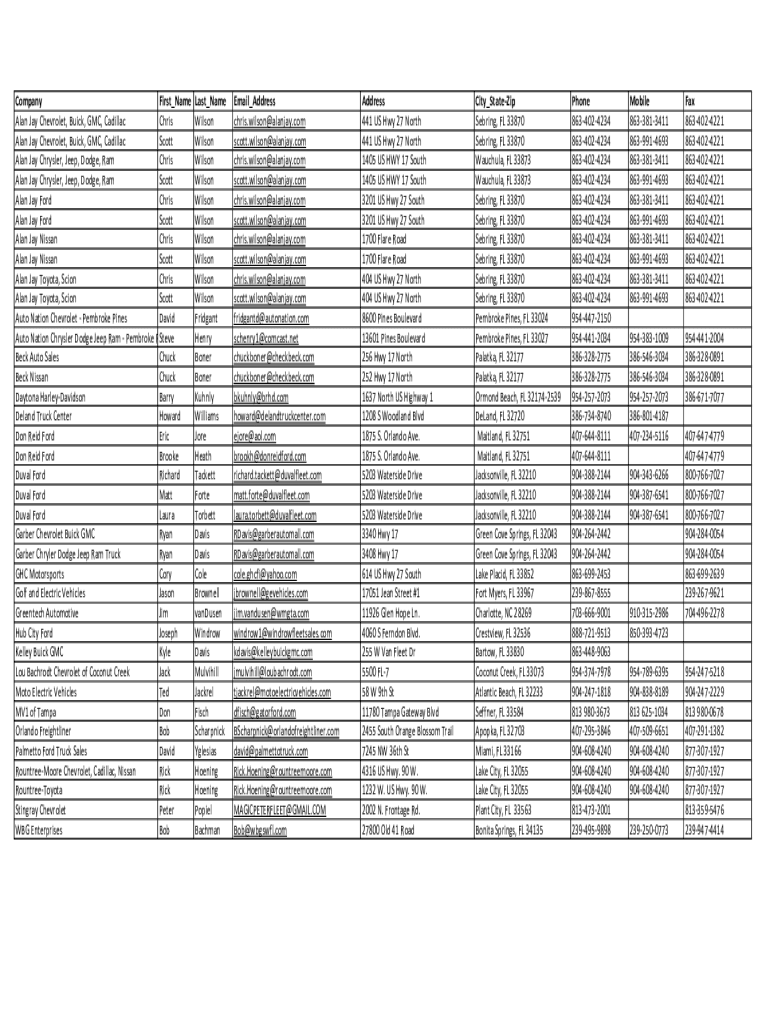 Company First_Name Alan Jay Chevrolet, Buick, GMC, Cadillac Chris Alan Jay Chevrolet, Buick, GMC, Cadillac Scott Alan Jay Chrysler, Jeep, Dodge, Ram Chris Alan Jay Chrysler, Jeep, Dodge, Ram Scott