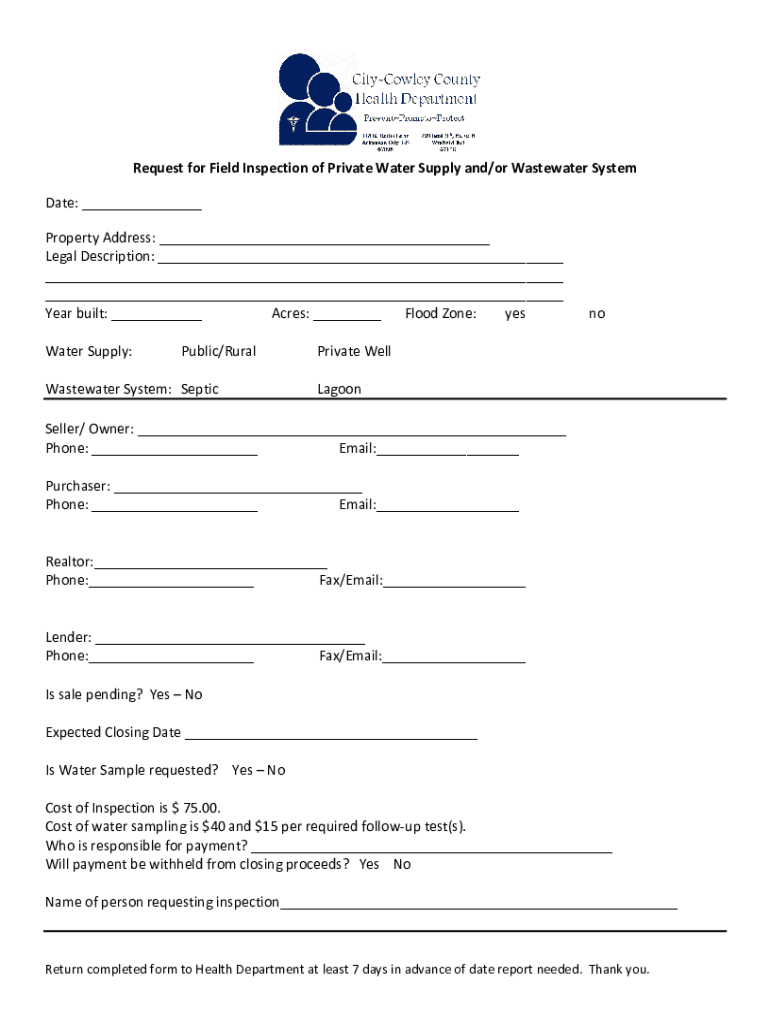 Request for Field Inspection of Private Water Supply and/or Wastewater System Date: ___ Property Address: ___ Legal Description: ___ ___ ___ Year built: ___ Acres: ___ Flood Zone: yes Water Supply:Public/RuralWastewater