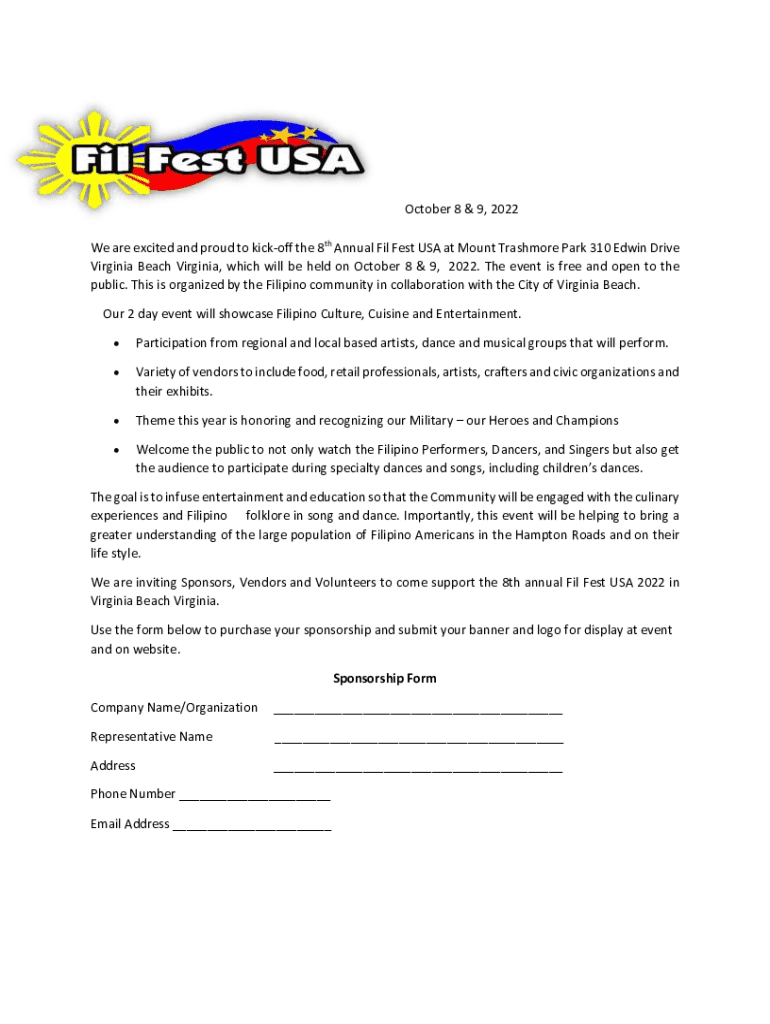 October 8 & 9, 2022 We are excited and proud to kick off the 8th Annual Film Fest USA at Mount Trash more Park 310 Edwin Drive Virginia Beach Virginia, which will be held on October 82022 & 9,2021
