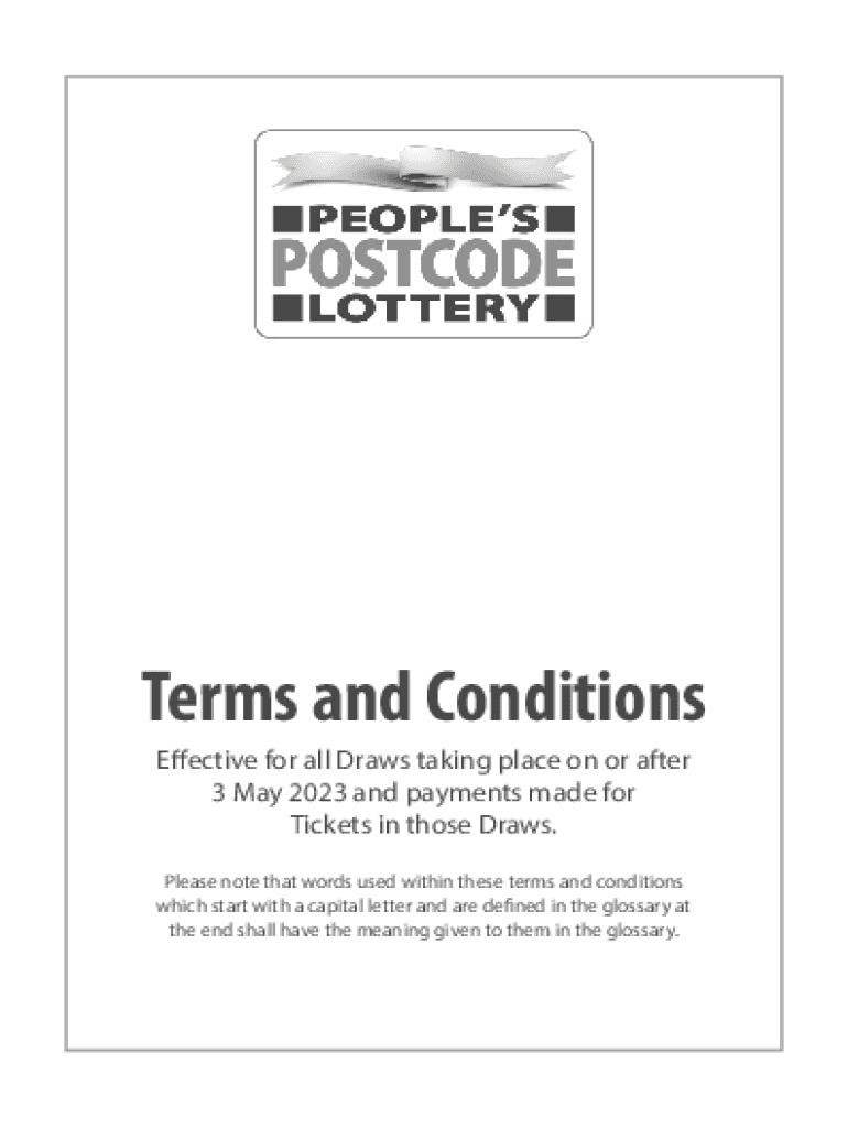 Terms and Conditions Effective for all Draws taking place on or after 3 May 2023 and payments made for Tickets in those Draws. Please note that words used within these terms and conditions which start