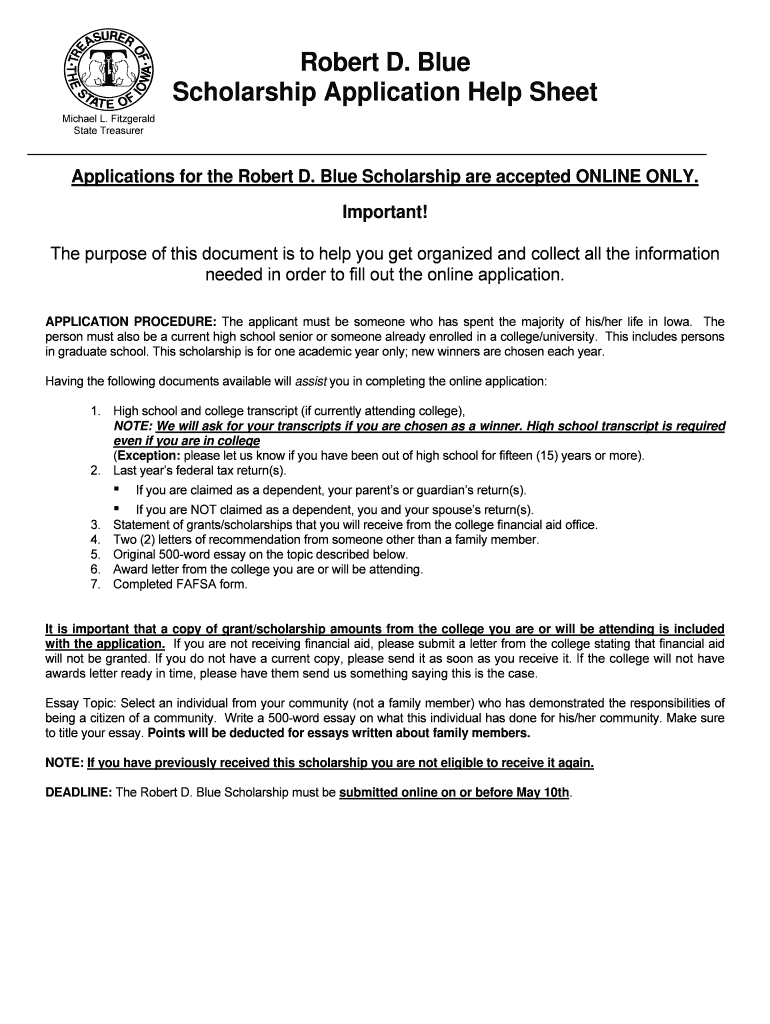 All students interested in applying for the Robert D. Blue Scholarship are required to file the application help sheet as part of the application process.