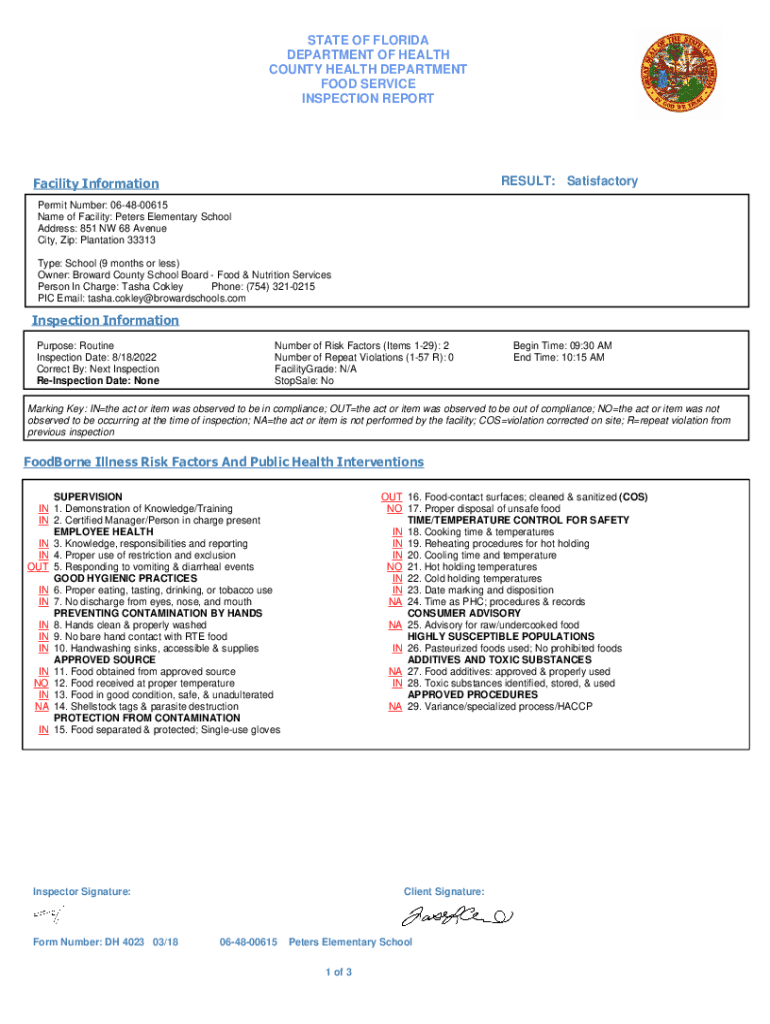 STATE OF FLORIDA DEPARTMENT OF HEALTH COUNTY HEALTH DEPARTMENT FOOD SERVICE INSPECTION REPORTRESULT: SatisfactoryFacility Information Permit Number: 064800615 Name of Facility: Peters Elementary School
