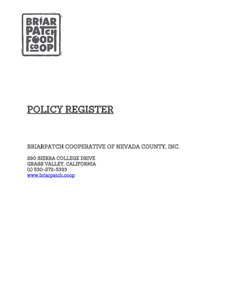 POLICY REGISTERBRIARPATCH COOPERATIVE OF NEVADA COUNTY, INC. 290 SIERRA COLLEGE DRIVE GRASS VALLEY, CALIFORNIA (t) 5302725333 www.briarpatch.coopTable of Contents A.GLOBAL ENDS.....................................................................................................................................