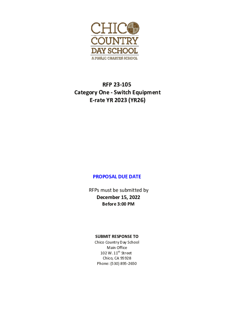 RFP 23105 Category One Switch Equipment Rate YR 2023 (YR26)PROPOSAL DUE DATE RFPs must be submitted by December 15, 2022, Before 3:00 SUBMIT RESPONSE TO Chico Country Day School Main Office 102 W.