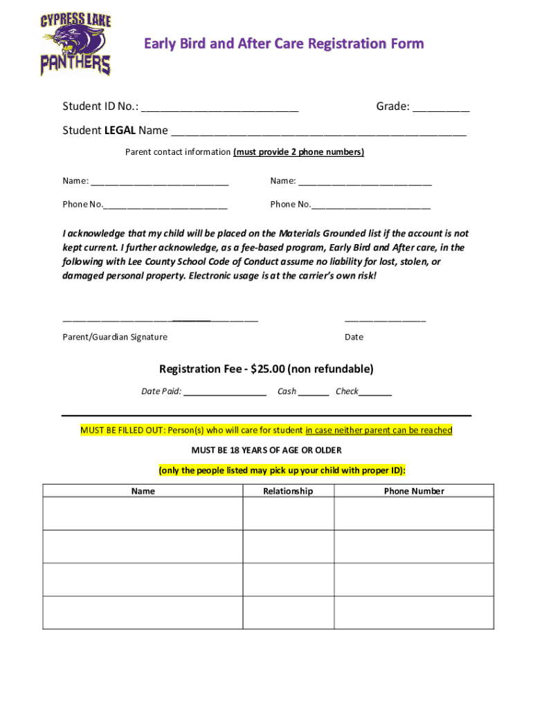 Early Bird and After Care Registration FormStudent ID No.: ___Grade: ___Student LEGAL Name ___ Parent contact information (must provide 2 phone numbers) Name: ___Name: ___Phone No.___Phone No.___I
