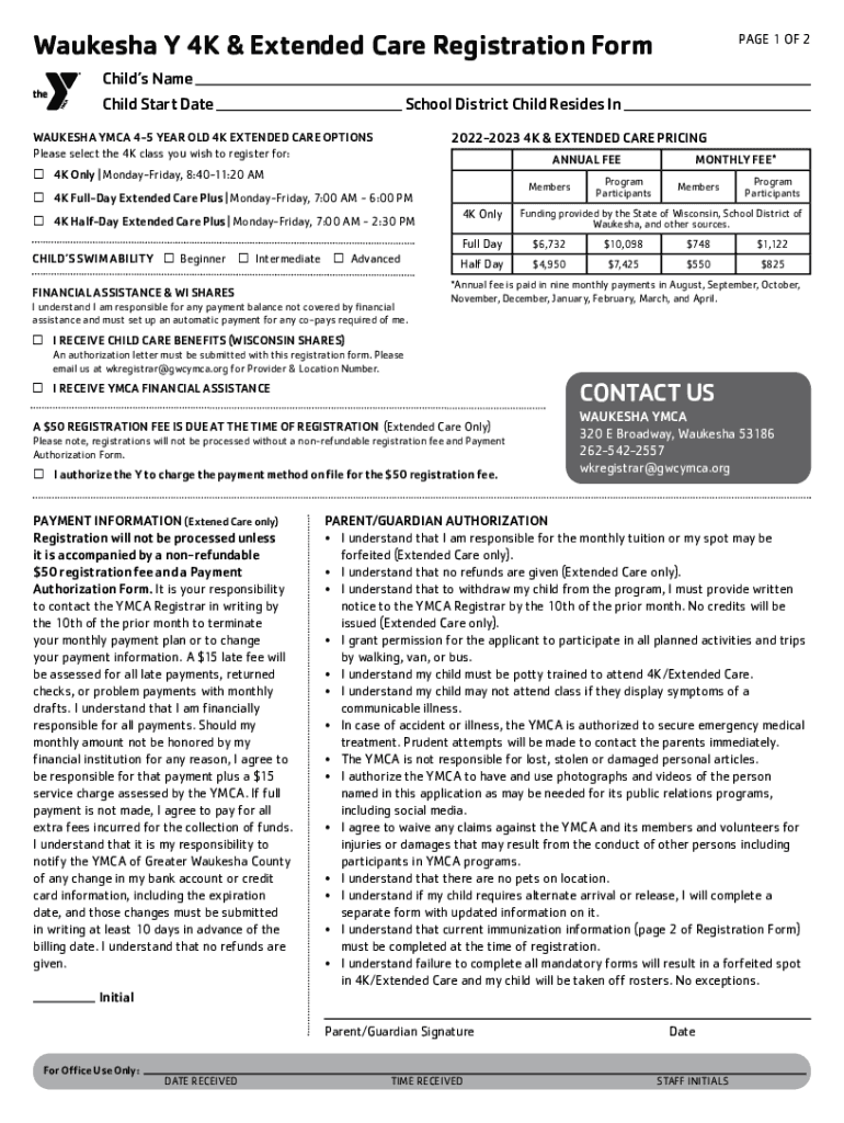 Waukesha Y 4K & Extended Care Registration Form Child's Name Child Start Preschool District Child Resides In 20222023 4K & EXTENDED CARE PRICINGWAUKESHA YMCA 45-YEAR-OLD 4K EXTENDED CARE OPTIONS Please
