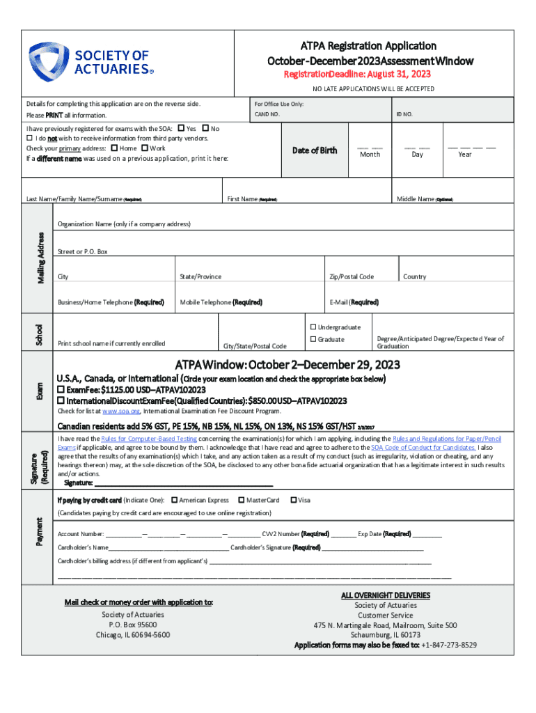 APA Registration Application October December 2023Assessment Window RegistrationDeadline: August 31, 2023NO LATE APPLICATIONS WILL BE ACCEPTED Details for completing this application are on the reverse