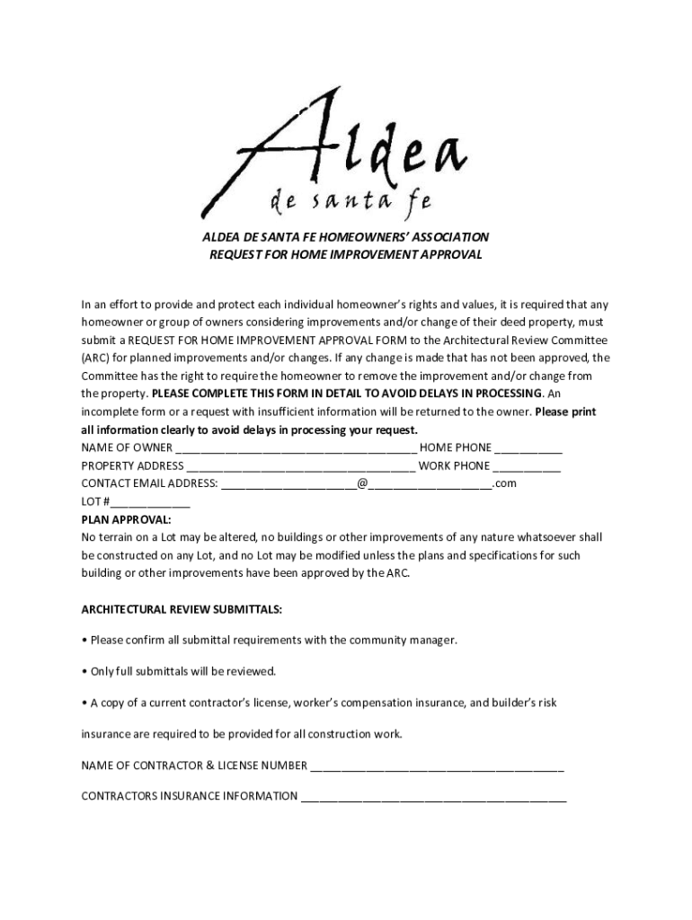ALDER DE SANTA FE HOMEOWNERS ASSOCIATION REQUEST FOR HOME IMPROVEMENT APPROVAL In an effort to provide and protect each individual homeowners rights and values, it is required that any homeowner or