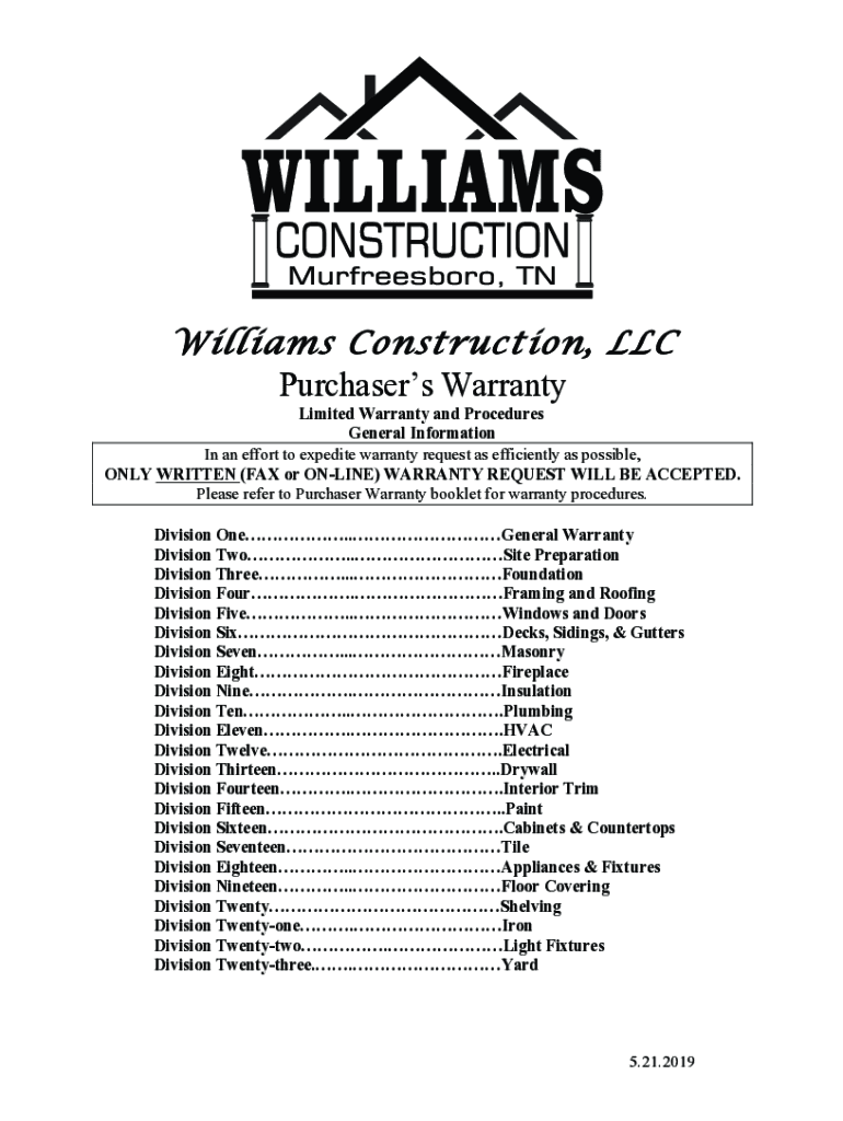 Williams Construction, Purchasers Warranty Limited Warranty and Procedures General Information In an effort to expedite warranty request as efficiently as possible, ONLY WRITTEN (FAX or ONLINE) WARRANTY