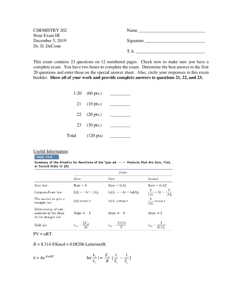 CHEMISTRY 202 Hour Exam III December 5, 2019, Dr. D. DeCosteName ___ Signature ___ T.A. ___This exam contains 23 questions on 12 numbered pages. Check now to make sure you have a complete exam. You
