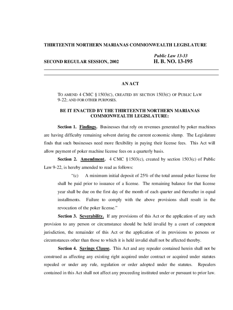 THIRTEENTH NORTHERN MARIANAS COMMONWEALTH LEGISLATURE Public Law 1333H. B. NO. 13195SECOND REGULAR SESSION, 2002AN ACT TO AMEND 4 CMC 1503(C), CREATED BY SECTION 1503(C) OF PUBLIC LAW 922; AND FOR