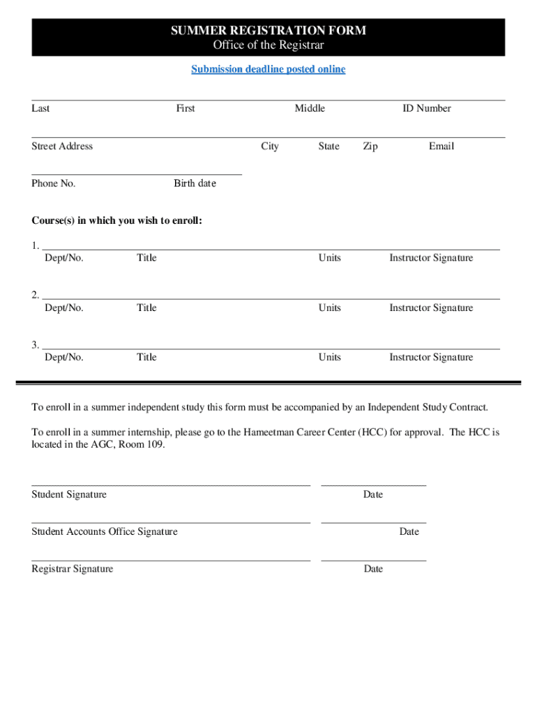 SUMMER REGISTRATION FORM Office of the Registrar Submission deadline posted online ___ Last First Middle ID Number ___ Street Address City State Zip Email ___ Phone No. Birthdate Course(s) in which
