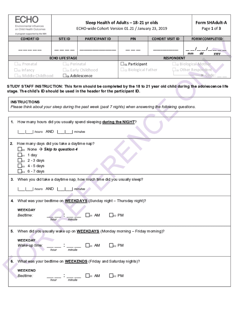 Sleep Health of Adults 1821 yr platform SHAdultAECHOwide Cohort Version 01.21 / January 23, 2019Page 1 of 3SITE PARTICIPANT IDPINCOHORT VISIT INFORM COMPLETED__ __ __ __ ____ __ __ _______ __ _______