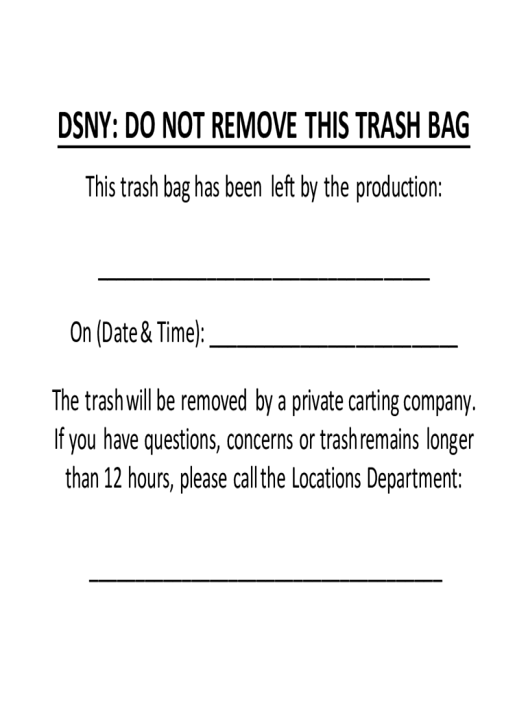 DENY: DO NOT REMOVE THIS TRASH BAG This trash bag has been left by the production: ___ On (Date & Time): ___ The trash will be removed by a private carting company. If you have questions, concerns